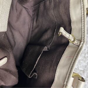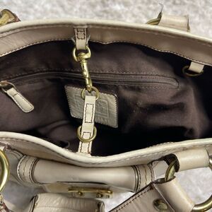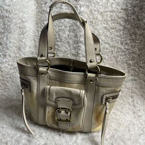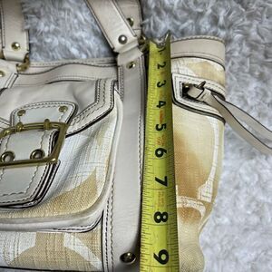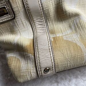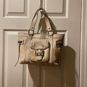 COACH LEGACY SIGNATURE CREAM &Beige Canvas Tote #7551 leather trims & Straps.Gold tone hardwares Front pocket with snap flop closure,two side zipper pockets top latch closure the inside lining has a side zipper two sides pockets.pre owned in good used condition the bottom of the bag has some transfer marks.see all pictures any questions please message M1