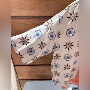 By Anthropologie Printed Short-Sleeve Linen Buttondown Shirt Top Cream compass