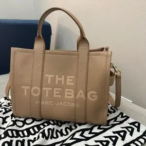 Elegant tan leather tote by Marc Jacobs. Features sturdy handles and detachable strap.