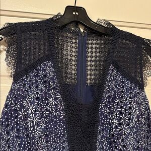 A signature style for the season with a blue floral print on the keyhole. This tiered, flared fit features sheer lace trim.