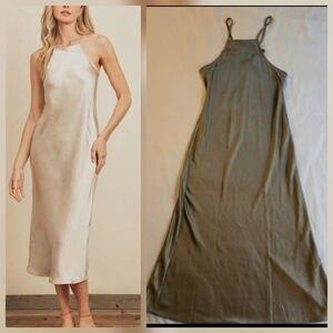 Dress Forum Halter Satin Tie Back Olive Green Midi Slip Dress 90s Y2K