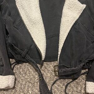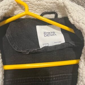 Chic black denim jacket. Features soft cream lining. Ideal for layering.