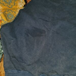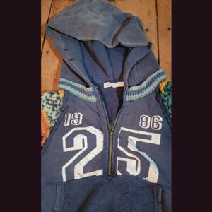 mixed media sweatshirt **has wear pls see all pics** worn in vibe by..rugged grunged out worn out & about..plus some irregularities in color of dye most notably on back. ***PICKS & PULLS IN MIXED LOOPY FABRIC POUCH**