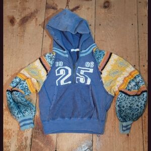 overall gen(x)eralization is unkept unconcerned aesthetic. 2nd decade 21st century imitating last decade 20th century grunge bummy chic essentially/other previous decade's demographics ..smells like hoboscentric an analgesic for the average angsty everyday hoodie via artsy sweater sleeves. srsly retro print roughed up.. it was as if fp went thrifting for 1980s inspiration and found a generic any highschool hoodie & paired it with snippets of neon print pta school mom sweaters w/skid row hairband wild cat prints for the sleeves.an amalgamation of 3 styles that separate might be lame .. but together, are sensational ..