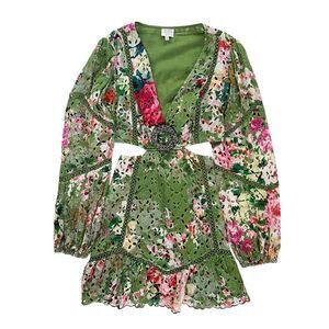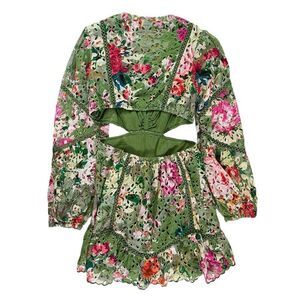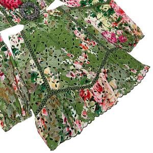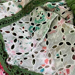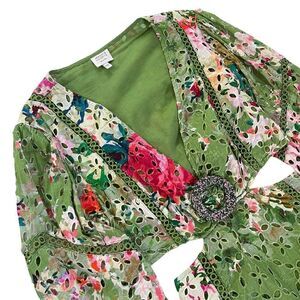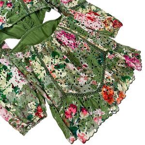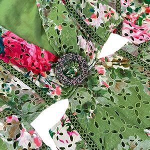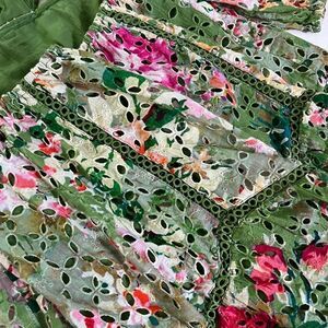 100% cotton. Made in India. Dry clean only. Fully lined. Pull-on styling. Front beaded O-ring accentBlouson sleeves with cinched cuffs. Waist and back cut-out design. Midweight eyelet fabric with ruffle hem. Our Style No. BENF-WD140. Manufacturer Style No. HN-ZARIA-5506.