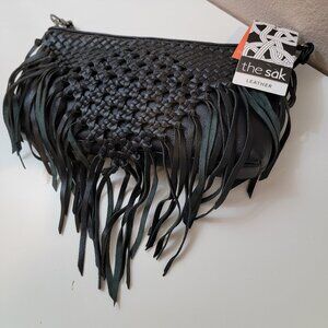 NWT The Sak Black Woven Leather Fringe Crossbody Bag Silver Hardware