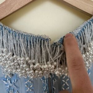 Vtg 60s Hand Beaded Dress Made in Hong Kong Ice Blue Pearl Collar Shift Flawless