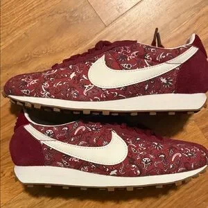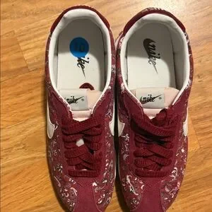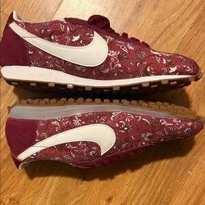Stylish Nike athletic shoes. Red paisley pattern with white swoosh. Comfortable and trendy.