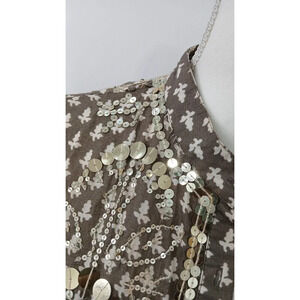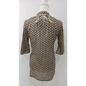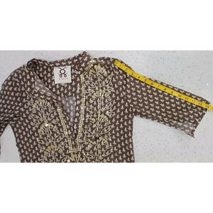 This beautiful Figue tunic top is a size XXS it brown with an ikat design and gold sequence and short sleeve with slits underneath . This top is preloved but still in great condition it is missing a few sequences which are shown in the photos but still does not take away from the beauty in the design. Refer to pictures for measurements.