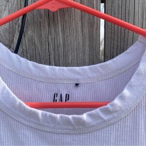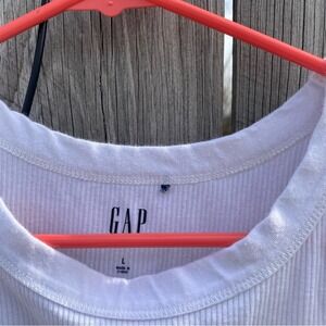 Gap ribbed tank top in a classic white shade offers a versatile staple for any wardrobe. This high-neck, sleeveless piece is crafted from a soft, stretchy ribbed knit fabric that provides a comfortable, body-hugging fit. Ideal for layering under cardigans or wearing on its own during warmer months, it features a clean hemline and wide straps for a modern silhouette. Note: There is a small faint mark near the bottom hem as shown in photos.