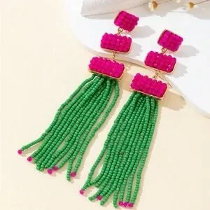 Vibrant pink and green beaded tassel earrings. Perfect for adding a pop of color.