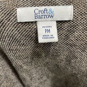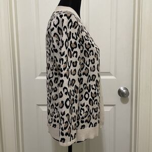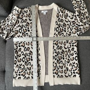 This is a Croft & Barrow leopard print open front cardigan in a women's size petite medium. It is in excellent preowned condition with no signs of wear. It is a cotton blend and is a tight knit sweater. Measurements are included in photos.