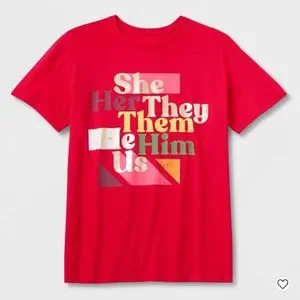 Stand up and display your support for the LGBTQIA+ community by sporting this Pride Adult Pronouns Short-Sleeve T-Shirt. Crafted from a soft cotton blend fabric in a regular silhouette, this crewneck tee offers you cool comfort, while the below-waist length provides versatile ways of styling. In a red hue, this printed tee features the pronouns "She, Her, They, Them, He, Him & Us" in a vibrant rainbow color palette for a colorful show of LGBTQIA+ pride and solidarity. A great piece you can pair with anything from biker shorts and leggings to skirts or jeans, you can also layer it under your zip-up hoodies or jackets, or above long-sleeve tees for cozy styling in cooler weather.