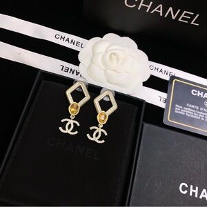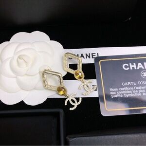 Chic CHANEL earrings with a diamond shape. Features gold and silver tones. Iconic logo detail adds elegance.