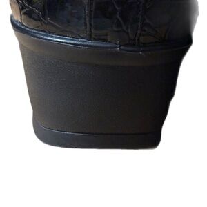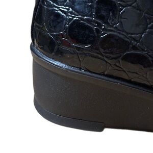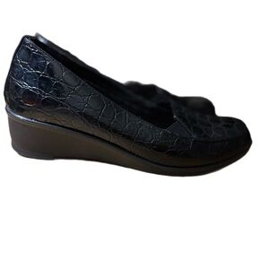 This is a pair of black croc embossed office loafers with a low stacked block heel. Designed for comfort blended with style, perfect for all-day wear, slip-on Women’s size 8.5 by Easy Street