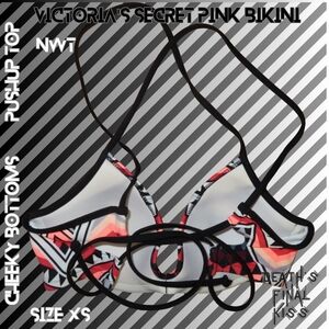 Brand new Victoria's Secret PINK bikini from 2017. Size XS. It is shades of Orange/Grey/Black/White. The ruched back cheeky bikini bottom has the tags attached. The corset laced back pushup bikini top is new without tags. Both pieces are in perfect condition.