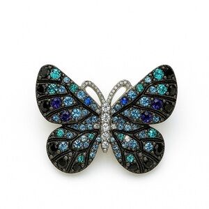 Chic butterfly brooch with sparkling black and blue stones. Perfect for a stylish accent.