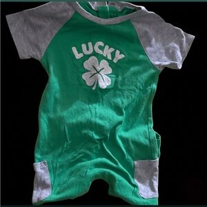 This delightful kids jumper features a vibrant green body with contrasting gray sleeves, highlighted by a playful 'Lucky' clover design. A fun addition to any child's wardrobe.