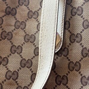 Elevate your style with this elegant Gucci tote bag. Featuring a classic beige and cream design, this bag is perfect for any occasion. The iconic Gucci pattern adds a touch of luxury to your ensemble.