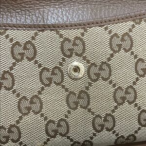 Elegant Gucci wallet with iconic monogram pattern. Features beige and brown tones. Has slightly worn corners and edges but very clean overall.