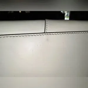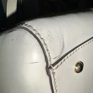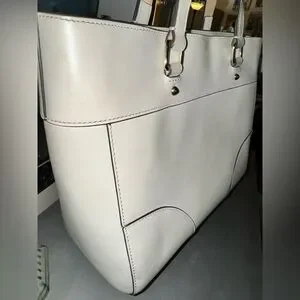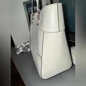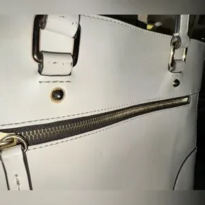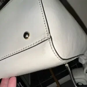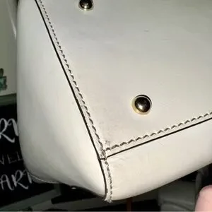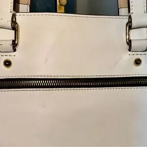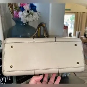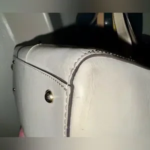 This elegant cream tote bag features a stylish blue accent bow, perfect for any occasion. Its spacious design and chic look make it a must-have accessory. Minor scuffs and scratches as shown in the photos, only visible close up. The front has three minor scuff marks, the corners a little rubbing, the bottom has a couple dark spots smaller than a dime. Other than that this is a very clean structured bag. Interior is red with No makeup or pen marks inside, and it has the key clip, Dooney label and serial number inside.