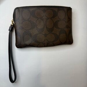 Elegant Coach wristlet with signature pattern. Features a convenient wrist strap.