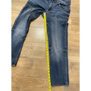 The BKE Buckle Mason Tapered Men's Jeans in size 32x28 offer a thick stitch design with whiskers detailing in a classic blue denim color. These versatile jeans feature a comfortable and stretchy fabric blend with a mid-rise fit, making them suitable for all seasons. The 5-pocket design and zip closure add practicality to the stylish and classic BKE Mason model, perfect for a Western, rock, cowboy, or timeless look. Ideal for everyday wear, these jeans can be easily machine washed for convenience. PLEASE SEE ACTUAL SIZE MEASURED FOR FIT.