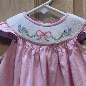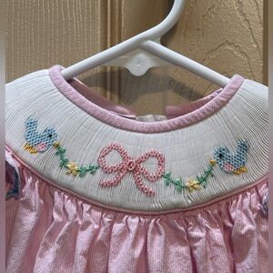 Anavini Hand Smocked Pink Dress Baby 12M Gingham Blue Bird Bow