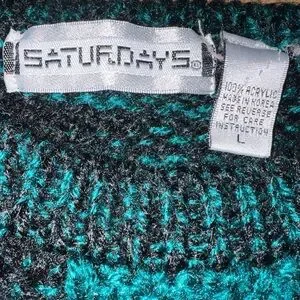 Level up your "Grandpacore" or "80s Dad" aesthetic with this vintage Saturdays brand pullover. Featuring a bold, high-contrast teal and black zig-zag/chevron pattern, this sweater has that perfect boxy, oversized silhouette.