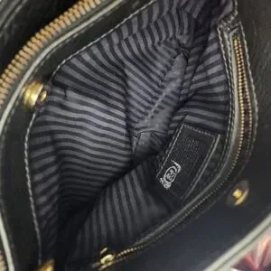 This bag has a roomy interior and three interior compartments and a zippered pouch. It also has a pocket on each side on the outside. Magnetic closures and middle compartment zips.