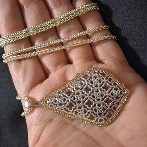 This is a Kendra Scott Aiden two-tone filigree pendant necklace with a extra long gold chain.