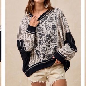 Stylish short sleeve top with floral and stripe design. Comfortable and chic. Perfect for casual wear.