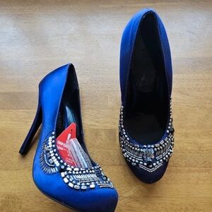 Step into elegance with these stunning blue satin heels. Featuring a beautiful beaded design, they're perfect for any special occasion.