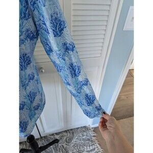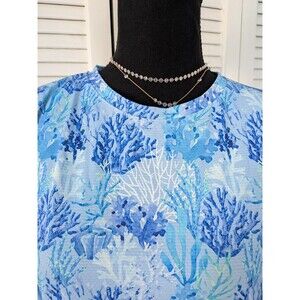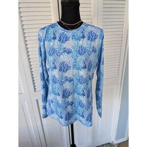 The X by GOTTEX Top in Blue and White is a stylish and functional activewear top designed for women. Made from a blend of polyester and spandex, this long sleeve shirt features a coral sea pattern, mesh under arms and side seams, crew neckline, and upf50 cooling technology. Perfect for activities like tennis, golf, or beach outings, this top provides both sun protection and anti-microbial fabric technology for optimal performance. The classic fit and mesh fabric make it comfortable and breathable, while the blue and aqua color scheme adds a pop of style to your wardrobe.