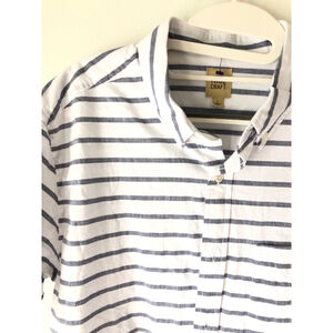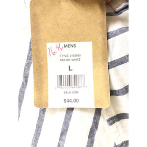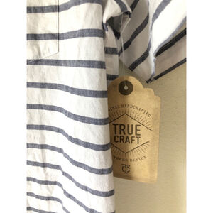 This is a new True Craft men's short-sleeve button-down shirt in size Large. It is white with blue stripes and features a single chest pocket. The shirt is made of a cotton blend and has a classic fit.