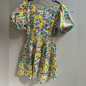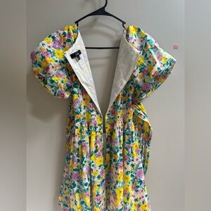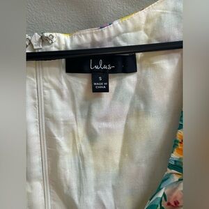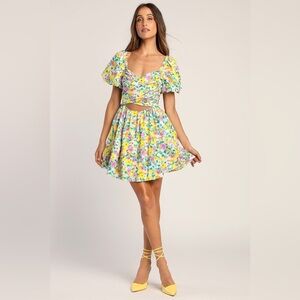 New without tags. This eye-catching Lulus mini dress features a vibrant multicolor floral print on lightweight woven cotton. Puff sleeves with elastic shoulders and cuffs add drama, while a flattering tie-front bodice and flirty waist cutout give it a playful, feminine touch. Elastic at the waist provides a bit of stretch in the front. Fully lined with a hidden back zipper and clasp for a secure fit. Perfect for vacations, garden parties, weddings, or a bold date night look.