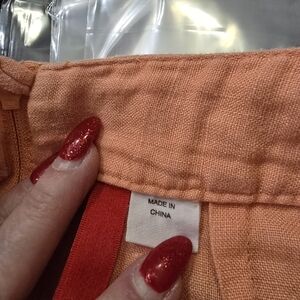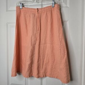 Elevate your wardrobe with this chic peach linen skirt. It features two front pockets, a drawstring waiat and zip closure at back. Skirt is A line. Perfect for any occasion, it offers both comfort and style. 1554-yss-1/25
