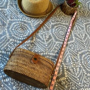 Stylish woven crossbody bag in a versatile tan color. Perfect for any occasion.