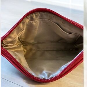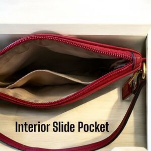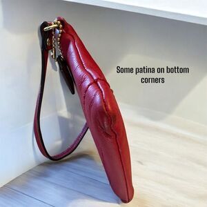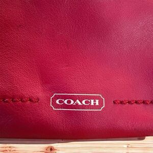 Keywords: Coach clutch, red leather clutch, women's clutch, evening bag, wrist strap, zipper closure, interior pocket, versatile accessory, pre-owned Coach, stylish clutch.