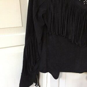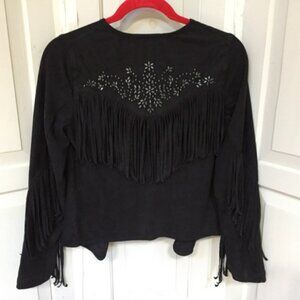 Stylish black faux suede cropped jacket with fringe and studded details. Perfect for casual wear.