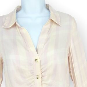 Pastel pink and the palest yellow cream are a barely there feminine plaid. The ruched front gives the button-front tradition a dainty look. Brushed material is soft to the touch and gentle against your skin.