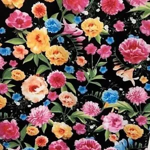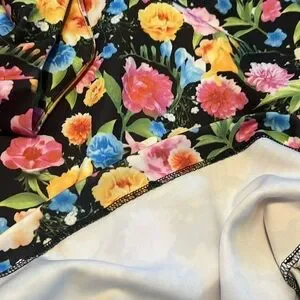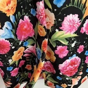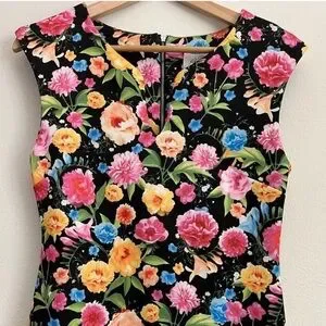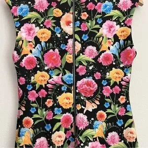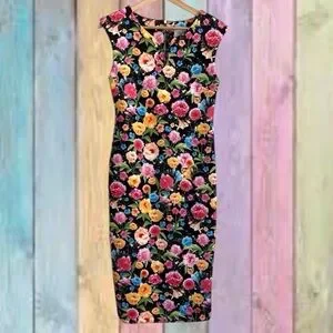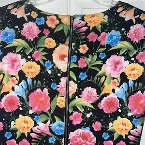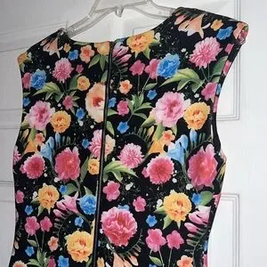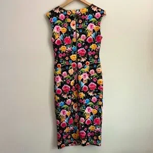 ~V fancy neckline~Sleeveless ~Back exposed zipper~Kick pleat~Stretch scuba material~Lined~Realistic floral print in pretty colors of pink, blue, orange, yellow & more~