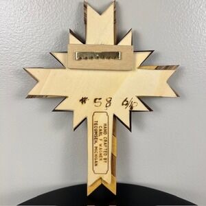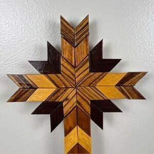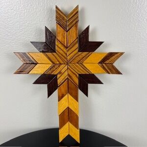 A striking geometric wooden cross wall art piece. This handcrafted cross showcases a unique Southwest-inspired design with a repeating chevron pattern in varying wood tones of yellow brown and dark brown. Its starburst points and segmented construction create a dynamic visual appeal. Perfect for adding a touch of rustic charm to a living room entryway or as a meaningful addition to a spiritual space.