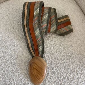 Add a touch of rustic charm to your outfit with this unique belt featuring a large wooden buckle. Crafted from olive green cotton fabric with striped accents and brown leather detailing, it offers a blend of natural textures and earthy tones for a versatile style statement.