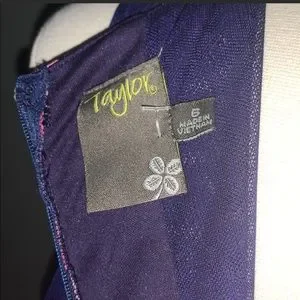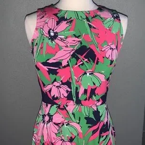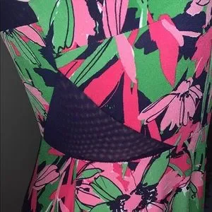 ~High round neckline~Sleeveless design~Lined upper~Navy blue mesh side & back panels~Back zipper closure~Floral colors in pinks, blues & greens