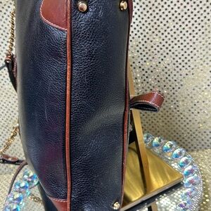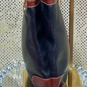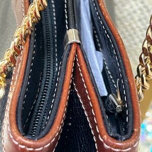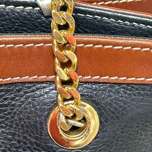 Stylish leather shoulder bag with gold chain straps. Ideal for versatile use. Double strap drop approx. 18”. They have chain link at the bottom and the rest of the strap is black leather and brown leather. Interior: black leather. It has 2 sections. One side has a zipper pocket and the other side is open no compartments. It has 4 gold feet on the bottom. This bag is in EUC no rips or tears.