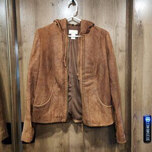 Lucky Legend Brand Brown Suede Vintage Jacket with hood and distinctive braided trim detail along the zipper line and cuffs.