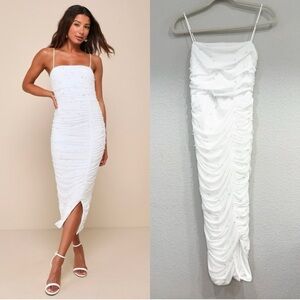 NWOT Lulus Toast to Romance White Ruched Pearl Bodycon Midiā Dress