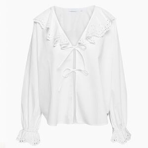 Pull some (heart) strings! This is a V-neck tie-front blouse with intricate lace detailing made with broderie anglais needlework. It’s made with lightweight and crisp cotton poplin that’s smooth to the touch.