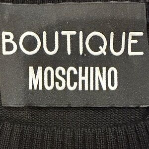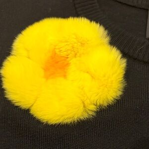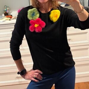 Black sweater featuring vibrant REAL FUR floral accents in yellow, red, and green. Stylish and unique design by Boutique Moschino. Authentic and in mint condition. Women’s US size 6